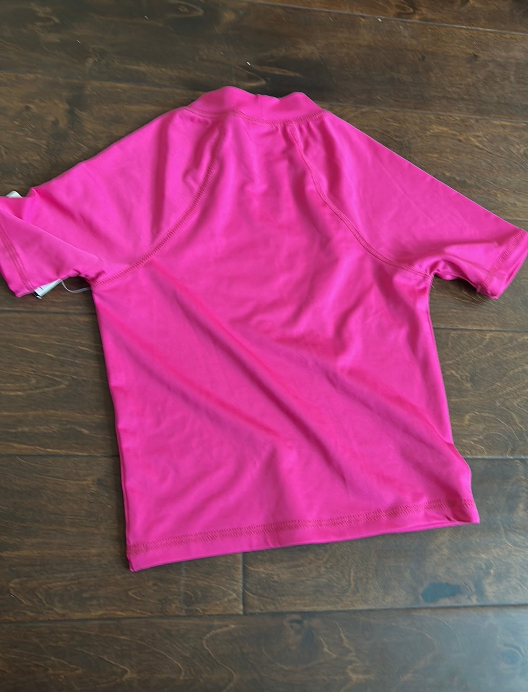 The Laguna Girls Swim Shirt Rashguard in size M features a vibrant floral tropical pattern, perfect for young girls who love the beach or pool. Made of a comfortable polyester and spandex blend, this short-sleeve top is machine washable for easy care. The tropical theme and bright pink color make it a stand-out piece in any girl's swimwear collection, providing both style and protection from the sun's rays.