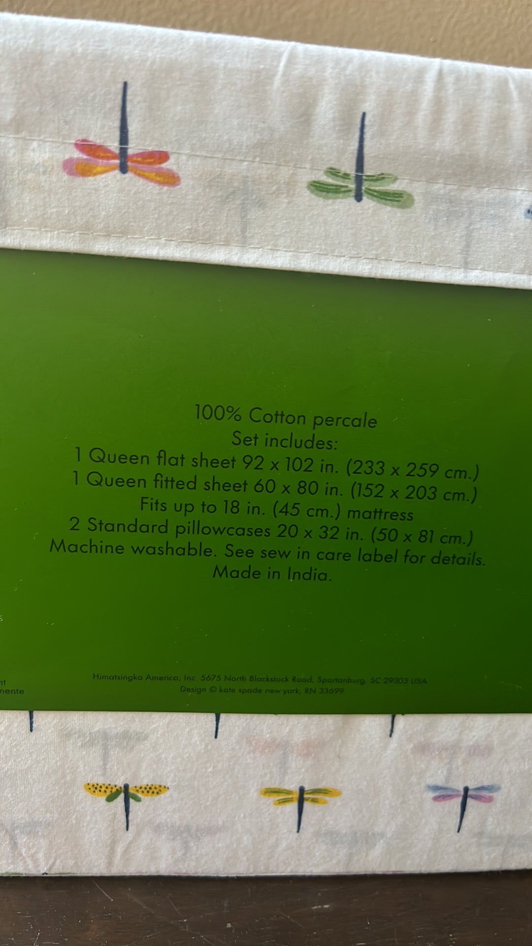 This is a full size 4-piece sheet set by kate spade new york featuring a colorful dragonfly pattern on 100% cotton percale material. The set includes standard pillowcases and is machine washable. It is designed in a cottage style and certified by STANDARD 100 by OEKO-TEX. Made in India, this designer sheet set is suitable for teens and adults, perfect for decorating kids' rooms, bedrooms, or guest rooms.