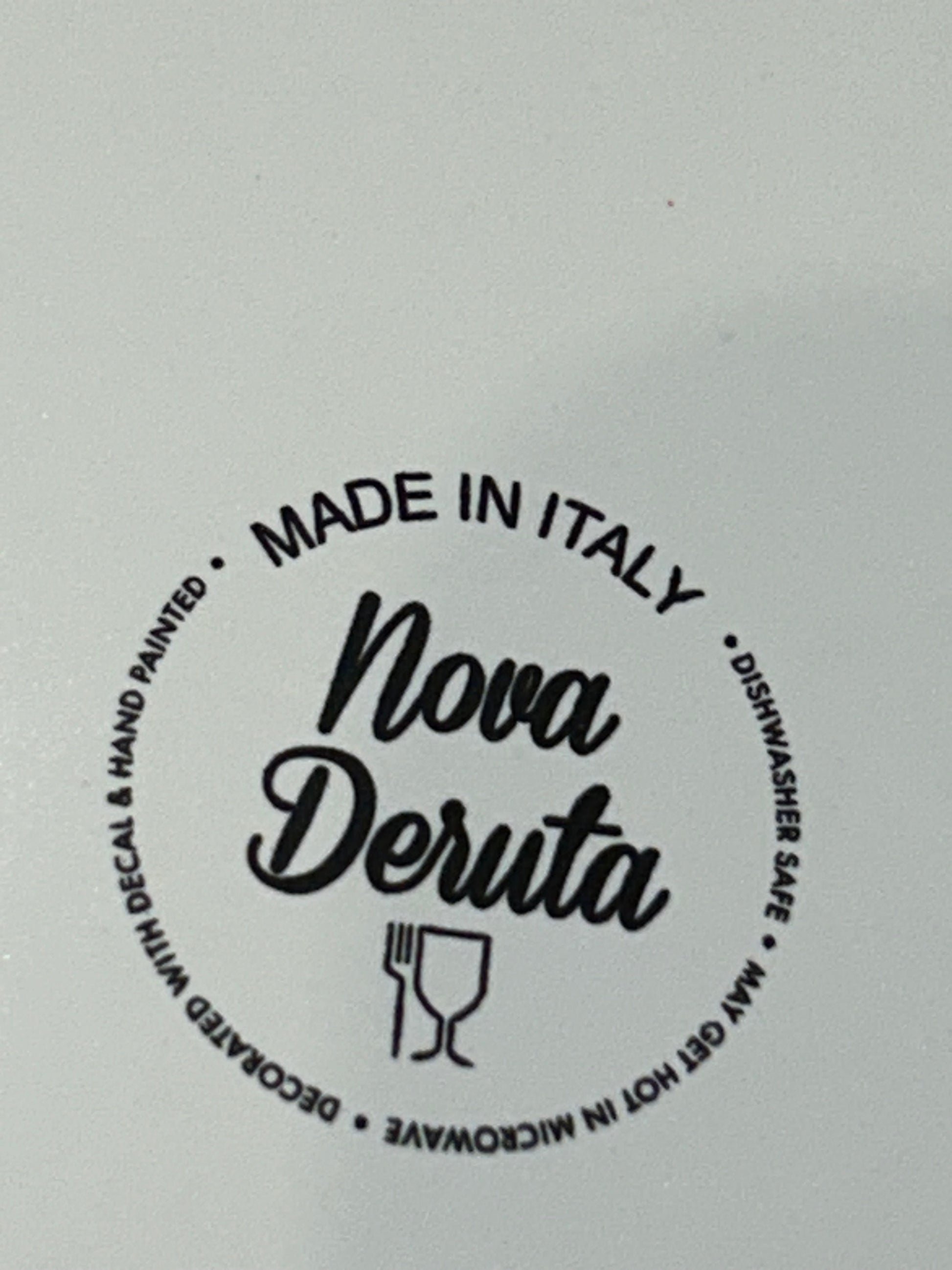 This is a festive Nova Deruta Christmas hand painted platter featuring a design of reindeer and evergreen trees. Made in Italy from ceramic, the oval-shaped scalloped edge platter is perfect for serving holiday meals or displaying as a decorative piece. 15”x11.5”