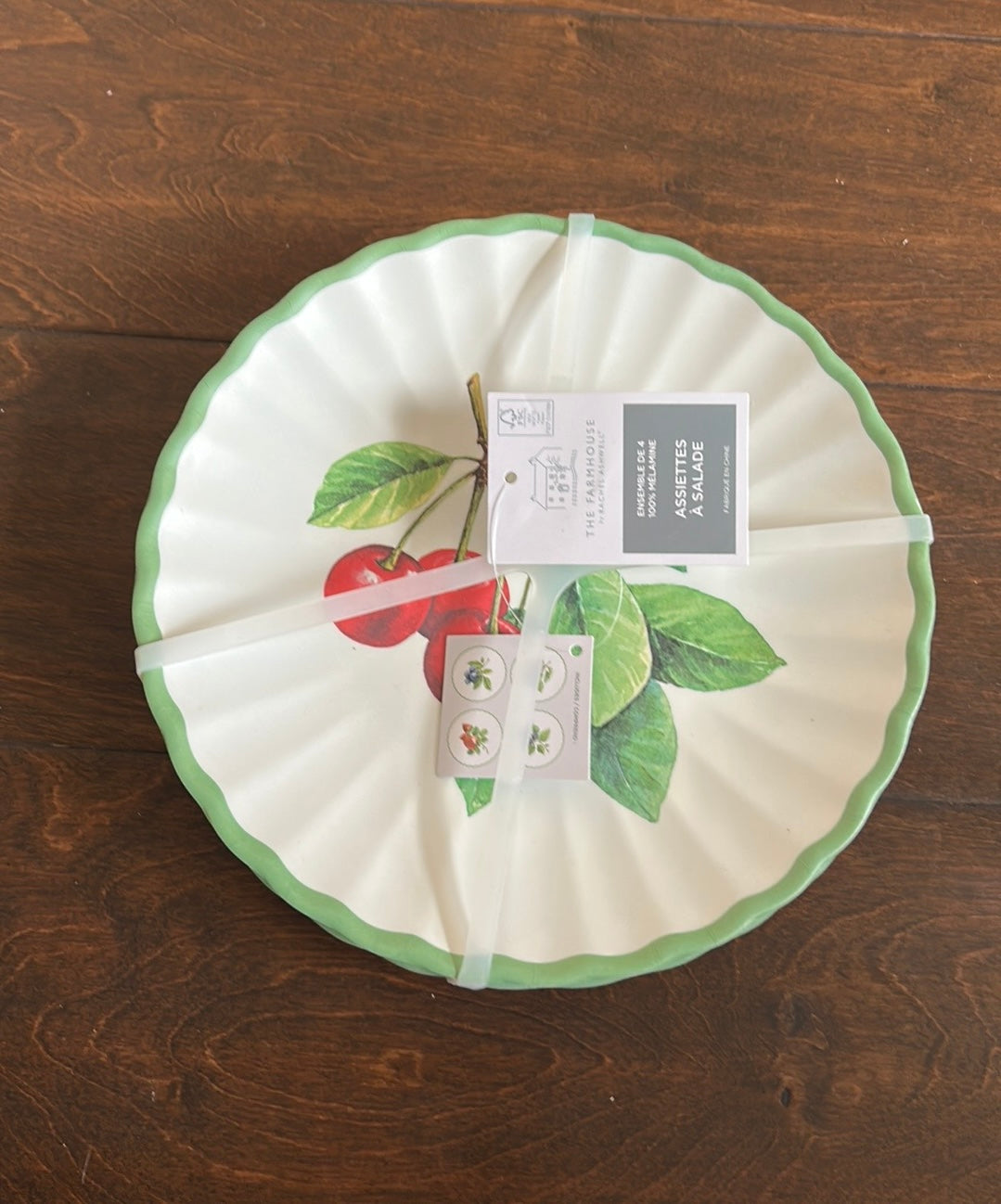 This product is a set of 4 appetizer plates by Rachel Ashwell featuring fruits & scalloped design. The plates are round in shape, multicolored, and made of melamine material. The scalloped edge adds a decorative touch, and they are dishwasher safe for easy cleaning. Perfect for summer and spring occasions, these plates bring a garden-themed element to your table setting for a vibrant and refreshing dining experience. Each plate has a different pattern .