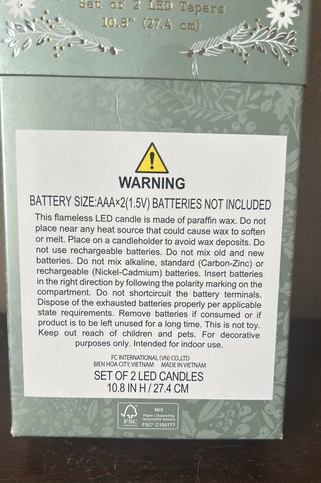 The Tinsel & Fir Flameless Taper Candles are a set of 2 LED Christmas tree shaped designed for use in decorating your living room during the holiday season. These candles are 10.8" in size and powered by 2 AAA batteries 1.5 V ( not included) making them easy to use and convenient for indoor space. Made of paraffin wax with a white shade color, these traditional-style candles feature a flameless design and are perfect for adding a festive touch to your Christmas decor.