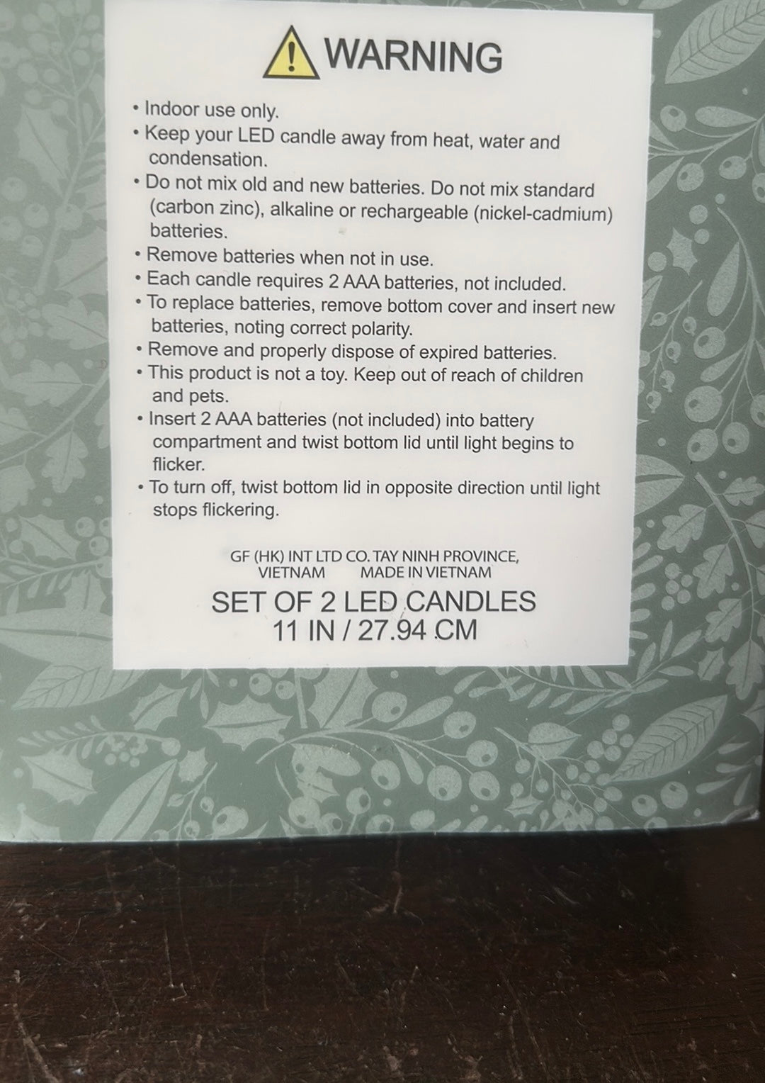 The Tinsel & Fir Flameless Taper Candles are a set of 2 11" LED Christmas tree-shaped candles in a green shimmery color. These decorative candles are powered by 2 AAA batteries each ( not included) and feature a traditional style with a flameless design. They are ideal for use in the living room as a Christmas decoration, adding a festive touch to your home during the holiday season. The candles are made of paraffin wax and require AAA batteries to operate, making them a convenient and safe option for indoor use.